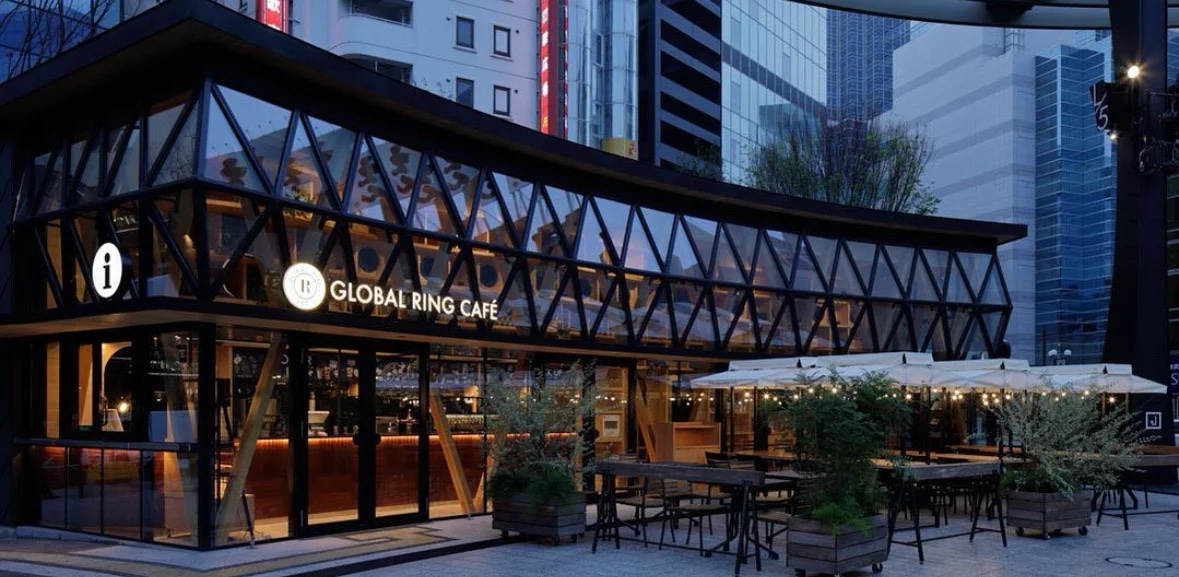 公園のシンボル「グローバルリング」に隣接しており、夜はライトアップされた幻想的な雰囲気を楽しめます。