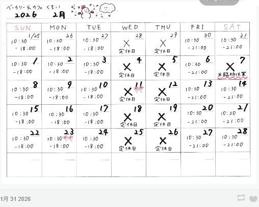 不定休があるため、最新の営業スケジュールは公式SNSを確認してください。