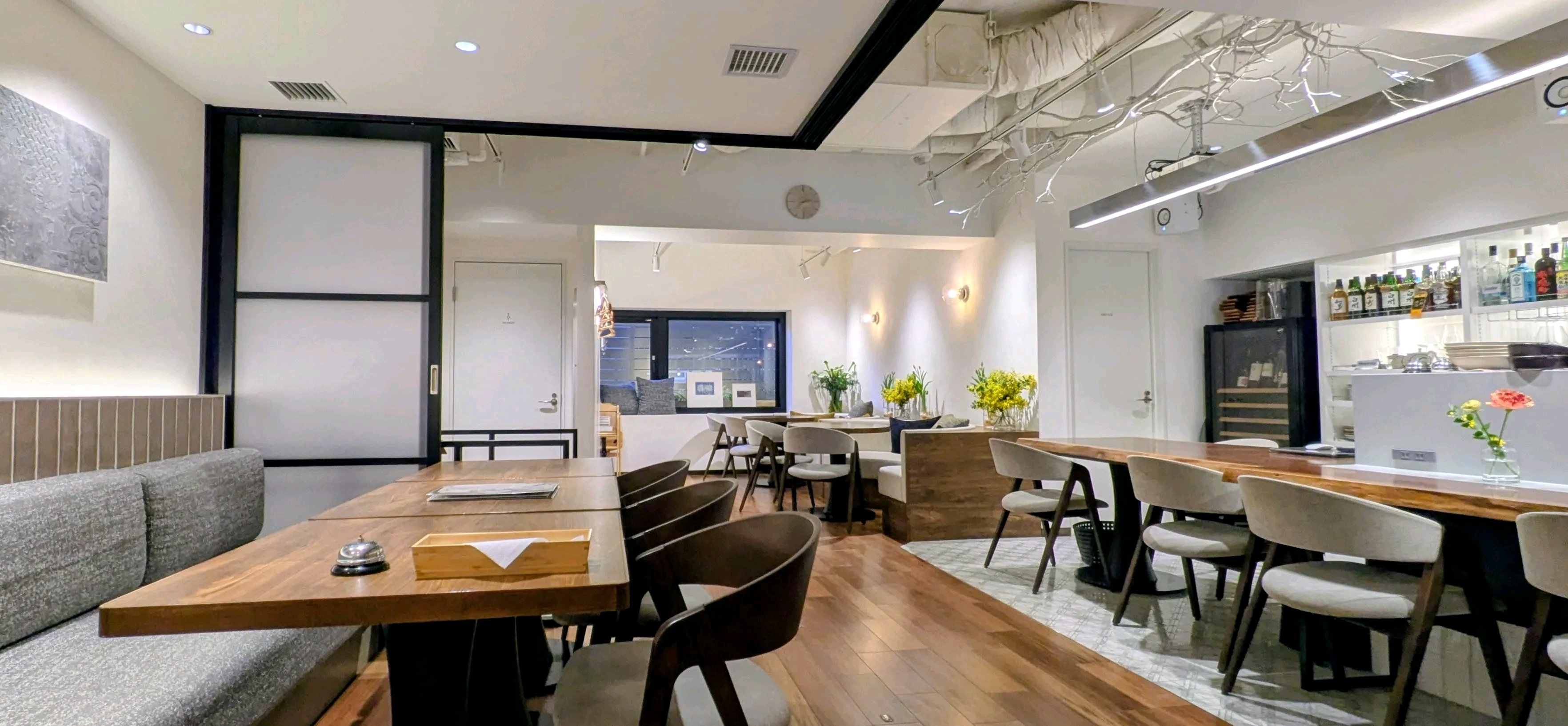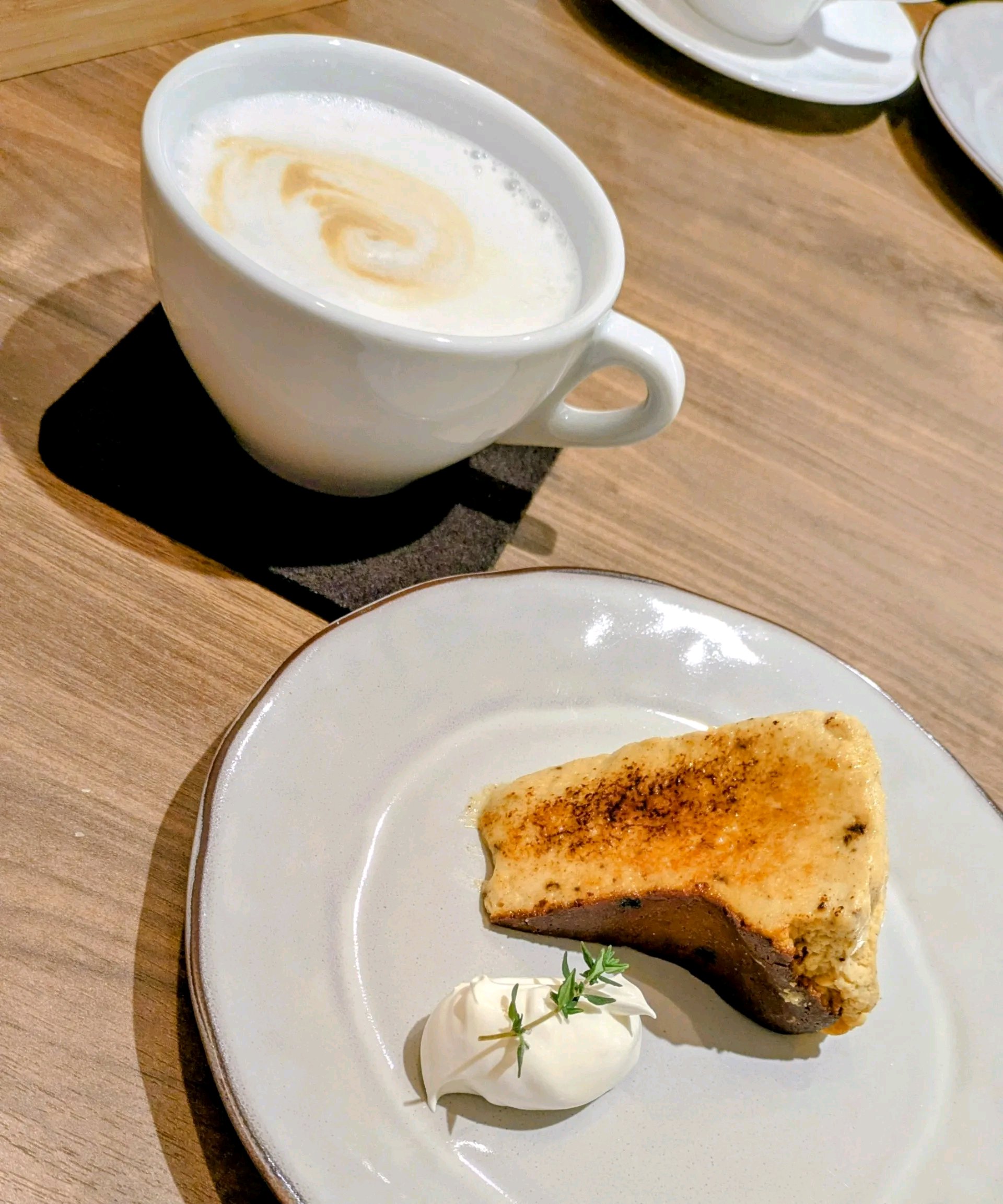 半2階のように入ってすぐのところに席があってお犬様も入れる席と階段上がってカウンター席と4人以上のテーブル席がたくさんある店舗なのですぐにはいれてありがたい。 白くて清潔感のあるオシャレな内装と感じるのは、各テーブルや棚には生花が飾ってあってしっかり手入れされていているからだと思う。 しかも一束がかなり多くて高級感も飾る。 天井に飾ってあるシルバーの枝も他にないデザインだな。 メニューはこだわりのスリランカ産のセイロンティーを使った紅茶やラテ系の種類も多く、麹ミルクや沖縄黒糖など珍しい物もある。お酒の種類も豊富。 デザートはフレンチトースト、ケーキ、カヌレ、プリンなどだいたい焼いている物でこだわりを感じる。 ブリュレアールグレイバスクチーズケーキは外側がカリッと薄いキャラメリゼされていて中は程よくやわらかくフワッと口でどけるしっかりアールグレイの華やかな味わい。 ラテはミルクがしっかりしていてエスプレッソもよく馴染んでいてしっかり美味しい。