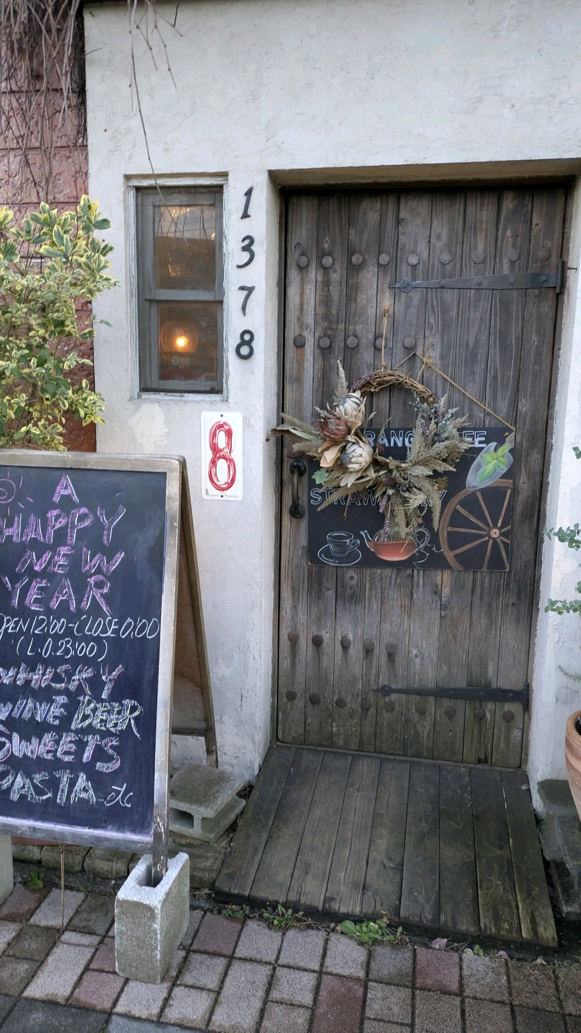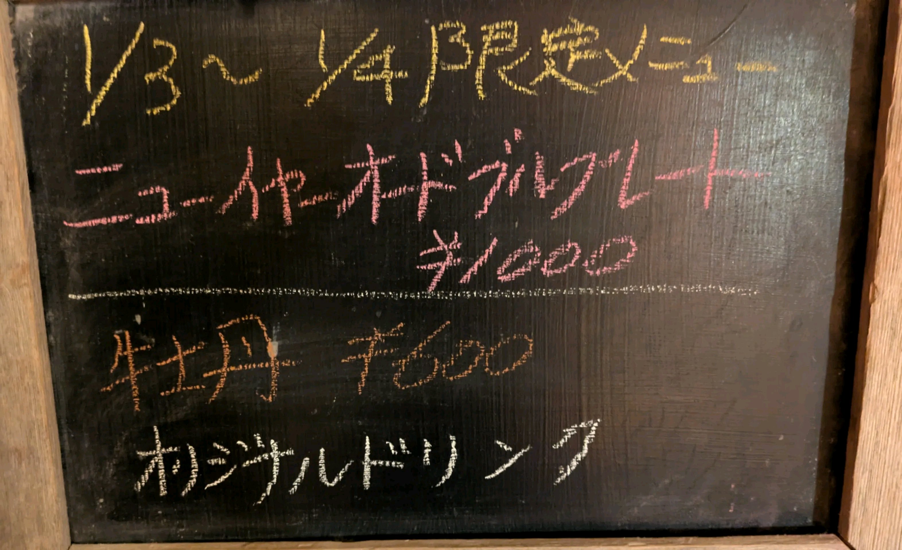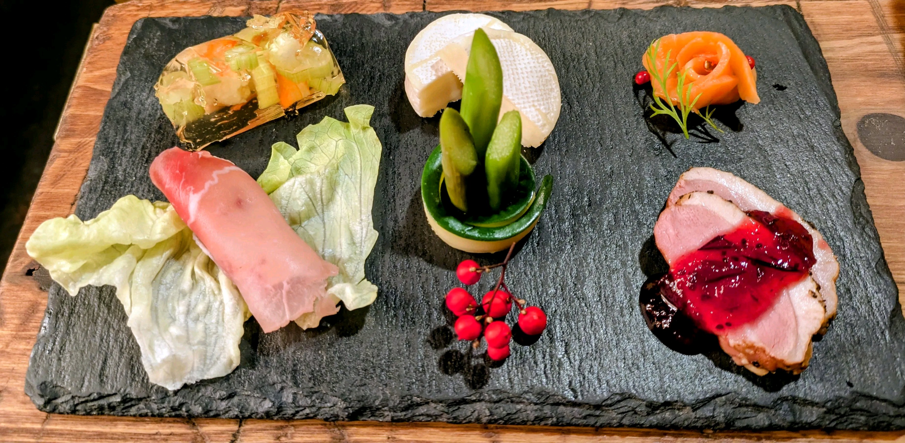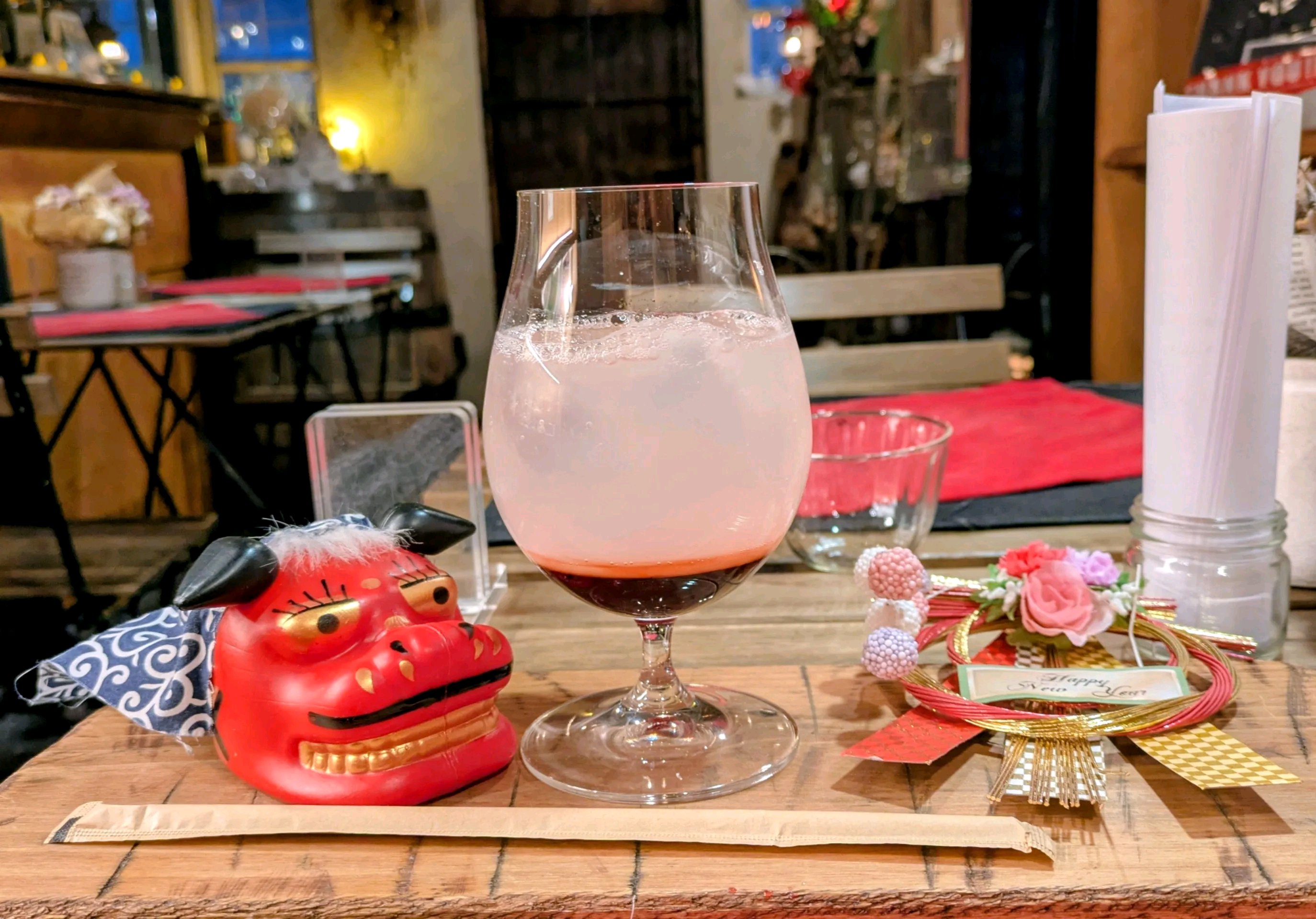 今年初オープン日、正月しか出してないプレートを頂く。 ニューイヤーオードブルプレートは六品目で去年と値段変わらず内容もあまり変わらない印象だけど、量を少なくしているそう。 カマンベールチーズのバラ ハチミツカマンベールチーズの生ハム巻き 鴨ハムのベリーソース添え セロリと海老の透明テリーヌ 門松は今年インゲンは高いのでアスパラになってキュウリで巻いてある オリジナルドリンクのボタンは淡いピンクに下が濃い赤で銀箔がパラパラ入っている。 炭酸、カルピス、ちょっとレモン、ラズベリー、ワイルドベリー、グレナデンで甘めのドリンク。