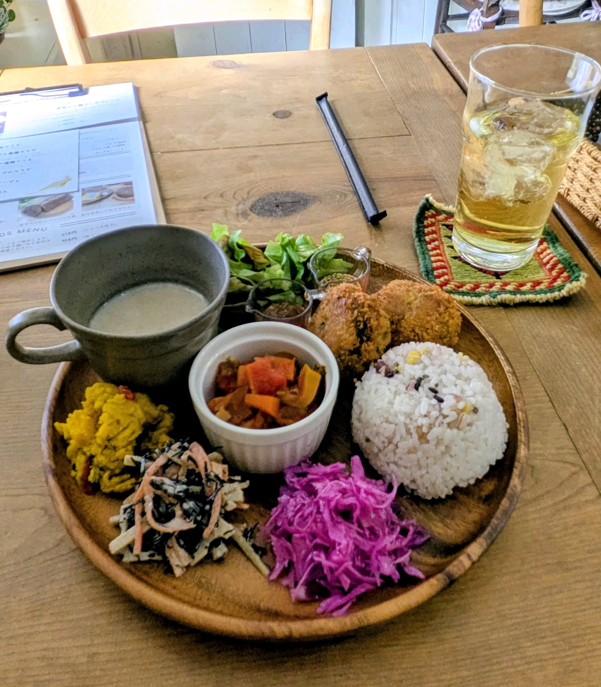 最寄り駅は向ヶ丘遊園だけど、登戸から20分かかって歩いてきた。どこから歩いても10以上かかりそうな立地。 店内は古民家をリノベした感じの古い木造建築を白で塗っている感じの内装、カントリー風に可愛く飾ってあり明るい雰囲気。 なかなか狭い空間に2人掛けテーブルが4つ並んだ空間と左手奥は座敷スペースもあるようだった。 ランチはハンバーグと週替りがあってどれも麹や栄養価が高いものや体の機能改善できるようなものを使っている。 週替りのメニューのドリンク付きにしてみた。 塩麹メンチカツ~特製柚子麹だれ~は小さめサイズが2つでサクサクに揚げられたメンチカツで柚子味噌のようなペーストの麹の味わいで細かいキャベツと玉ねぎのシャキシャキ感も良い。 自家製麹ドレッシングのサラダはドテラミネラルとエッセンシャルオイルを使用した自家製塩麹で旨味もあるちょっと変わったカラッとした脂感。 かぶの甘酒ポタージュはドロドロとサラサラの間で芋っぽいホッコリ感とあとからカブの味が来てかなりシンプルでさっぱりした味わい。
