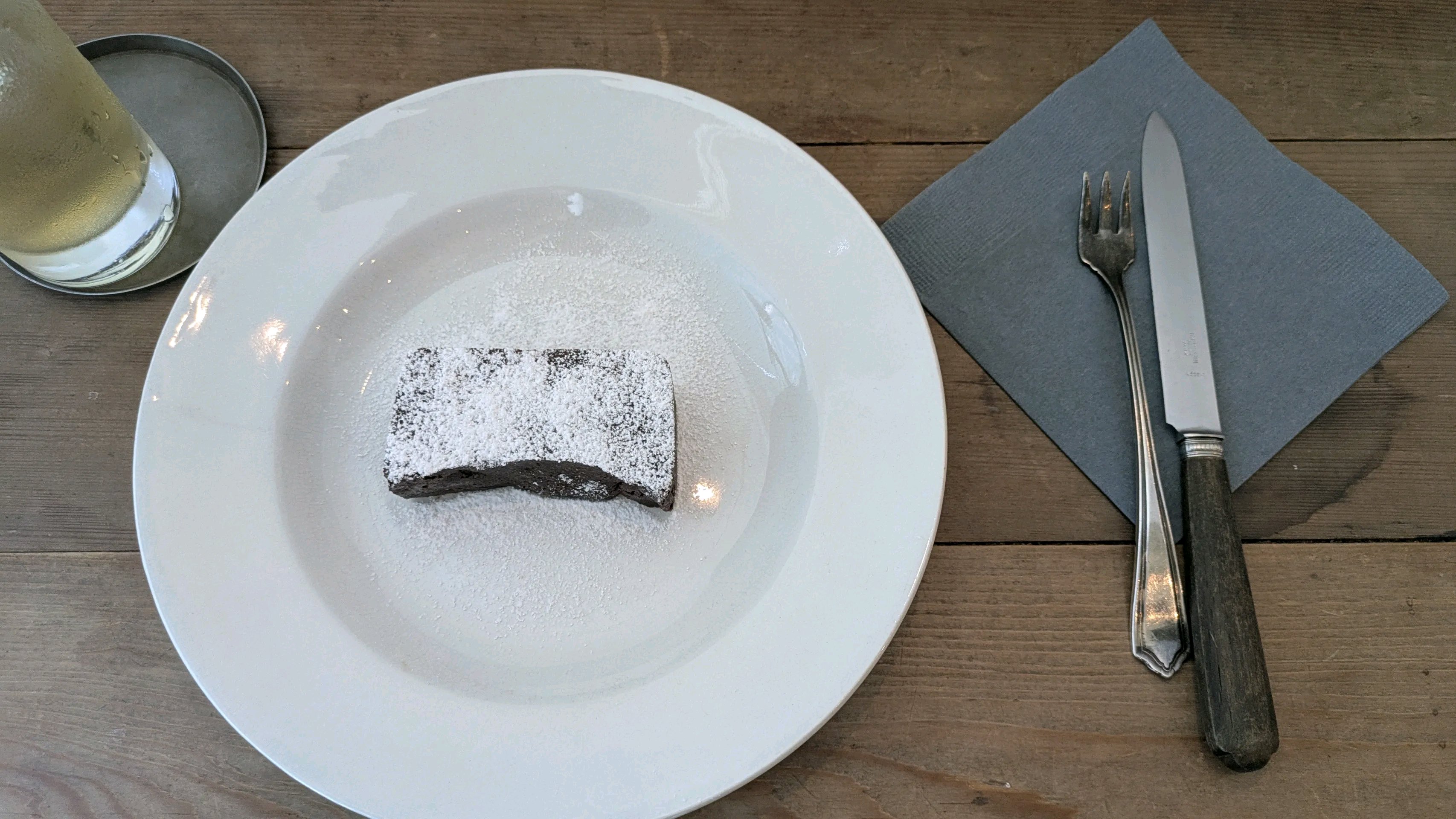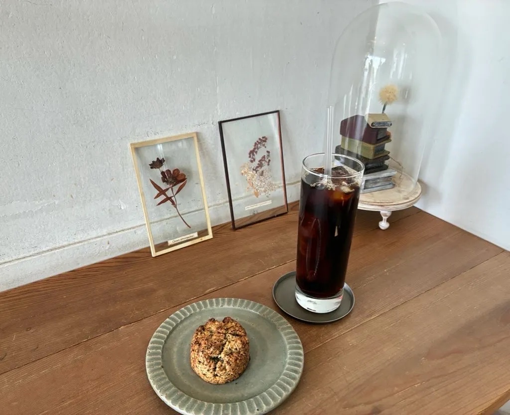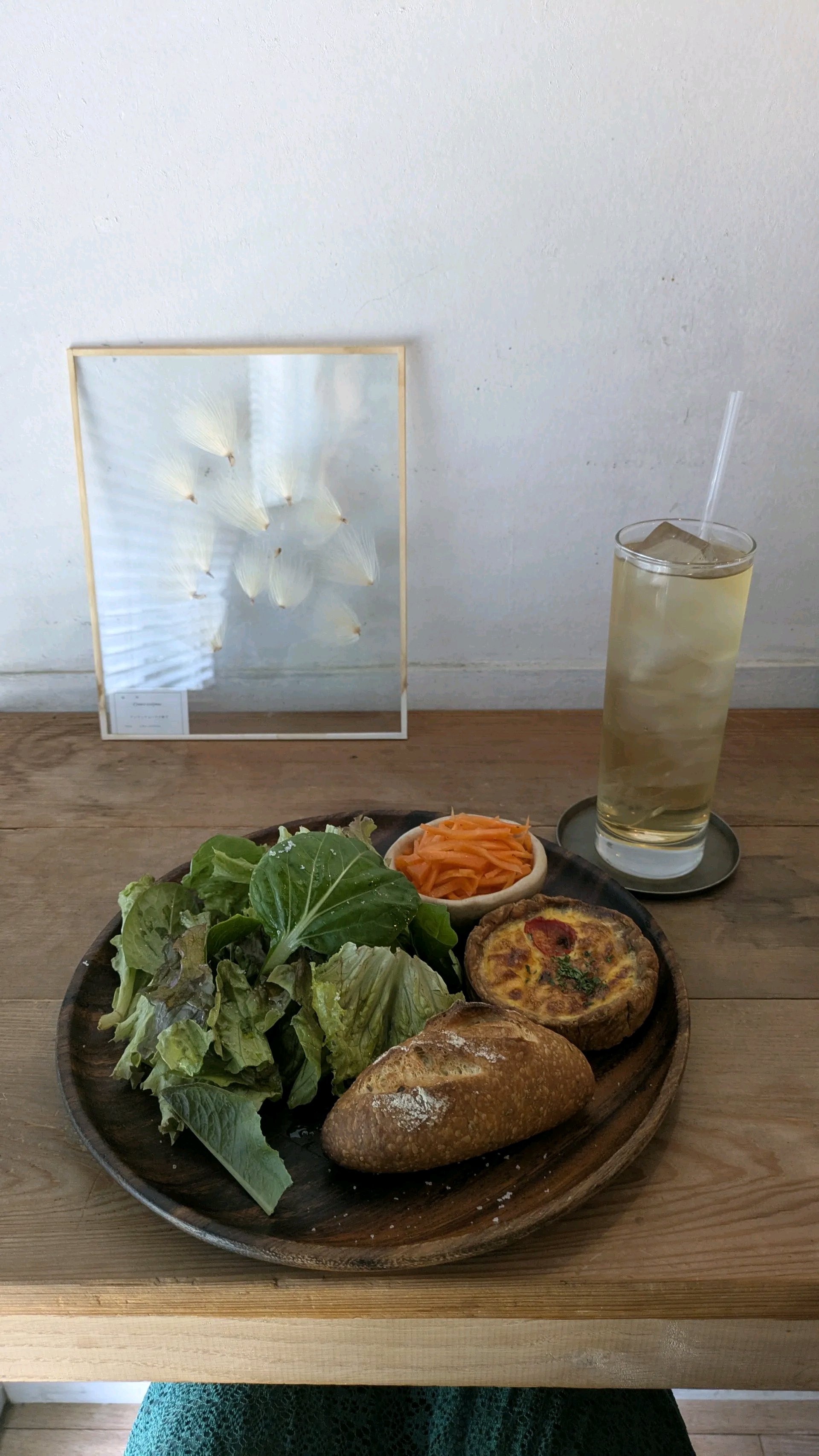 雑司が谷からすぐだけど今日は高田馬場から歩いてだいたい25分ぐらい。ビルの2階にあるヴィンテージ調のシックなベーカリーカフェ。 ドアを開けて入ると天井は打ちっぱなしのコンクリートで壁は白、床と家具はアンティーク調の木で植物の押し花標本やドライフラワーで作られている置物など全体的に素朴な温かみを感じる店内で照明は暗めの小さい丸い電球がつられている。 木製のピアノや大きいテーブルに飾られた植物も雰囲気に合っている。 カウンターで注文会計する。イートインメニューはトースト系にサラダが着いたワンプレートと、好きなパンを得られない選べる物があった。ケーキはキャロットケーキ、ガトーショコラなど4種類。パンはアンパンや小さいフランスパンなど。 グリーンのサラダはオリーブオイルと深みのある塩味がおいしい。余ったオイルと塩がまたハーブパンと合う!キッシュはザクザクで硬めで薄いパイ生地がバターと塩味が効いてて、厚手だから小さくても食べ応えある。 ハーブティーはホットかアイスとローズかバタフライピーで選べてアイスローズにした。かすかに酸味がある飲みやすいハーブティー。 ショコラテリーヌを注文。