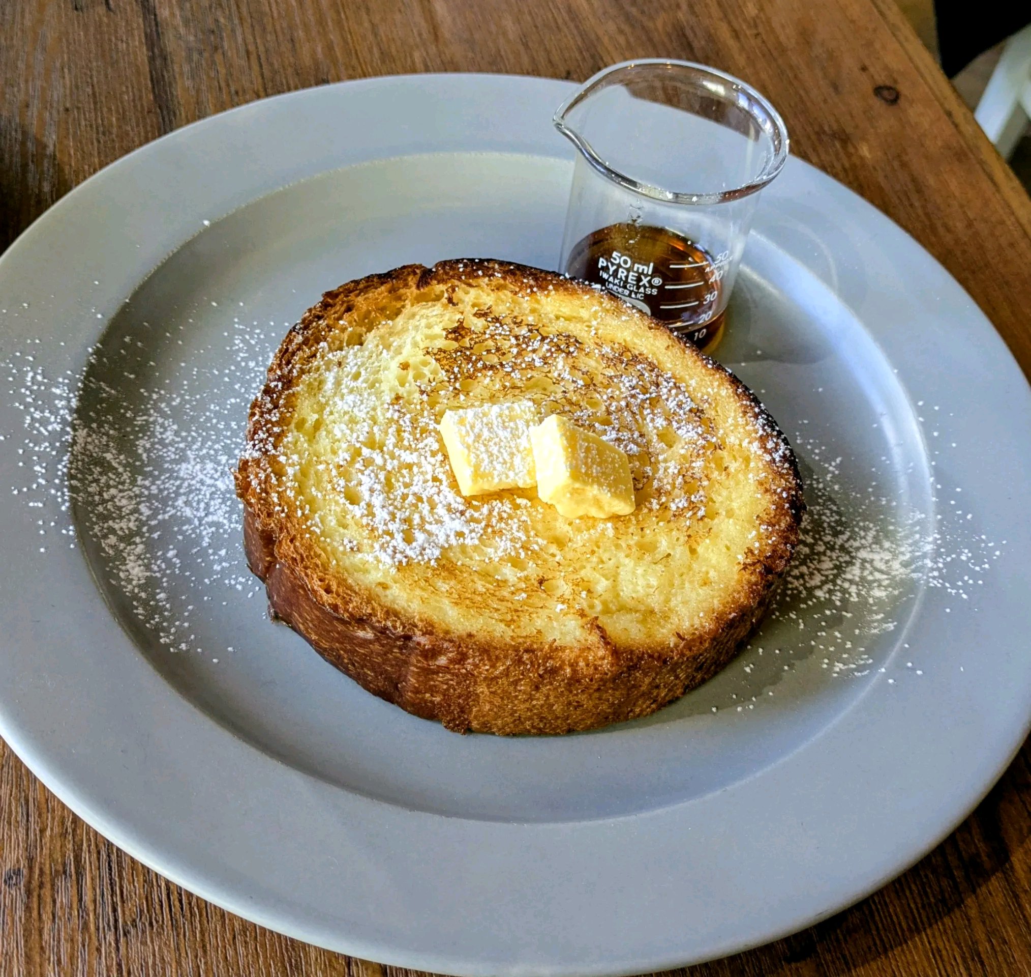 ニューヨークにありそうなオシャレな照明とルックス出来そうなソファー席や大きなウッド調のテーブル席と女の子とパンケーキの大きな絵が印象的なお店。 お昼時だけど平日というのもあって混んでなかったけど、しばらくして結構入って来て2人席と4人席は埋まってた。 デザート系が食べたかったので気になるデザートとドリンクを注文。 クラシックフレンチトーストは本厚木のNOPELLというパン屋さんのパンらしいのだが、ほんとにここ本厚木?というぐらいお口の山でやってるお店で、ブリオッシュ生地がふわふわなフレンチトースト。 卵をたくさん使っているようで真ん中の辺りはとろとろで塩バターとメープルシロップで甘みや旨味がまして美味しい。 チャイはuRn.chAi&TeAのロゴが載ってたけどあのお店のを使ってるのかな? すごく細かいスパイスのサラサラ感があってしっかりスパイス効いてて、やはりスパイスのバランスがよいから色んなスパイスの作用で後味まで辛めで良い。