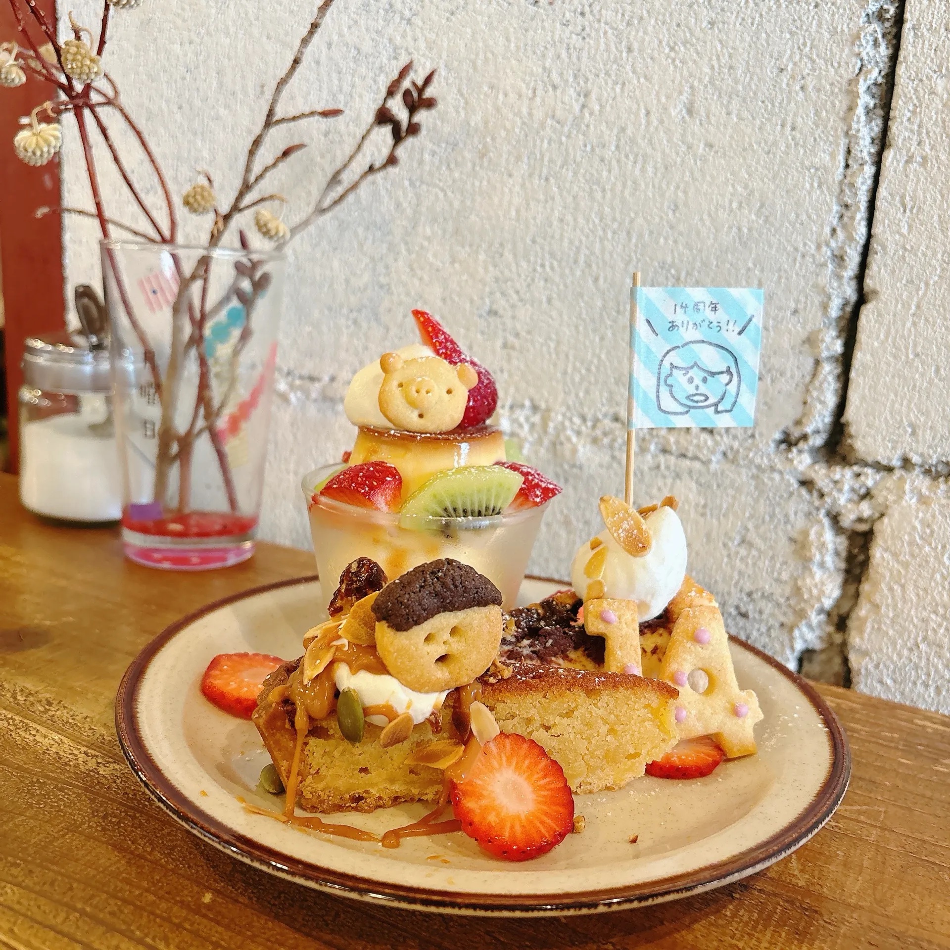 14周年限定おやつプレート ・ラム酒香るチョコチップチーズケーキ ・キャラメルクリームとナッツのアーモンドタルト 暖かい空間のカフェで満たされました𓂂𓏸